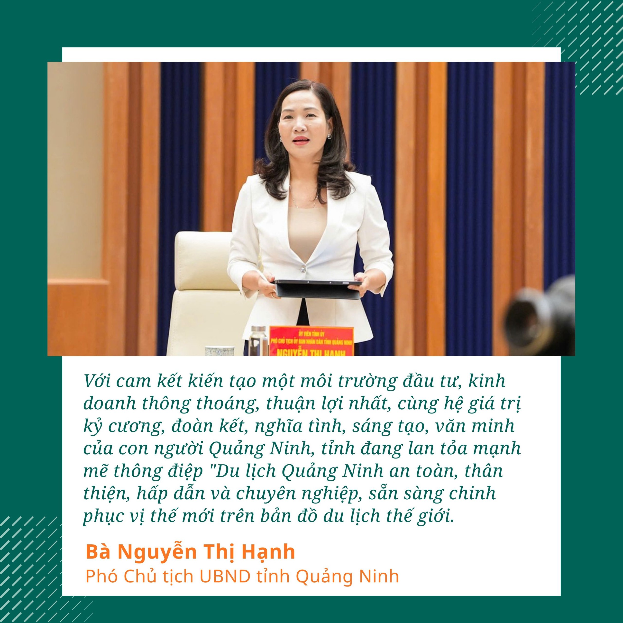 Với những chiến lược phát triển đã và đang được định hình và những giải pháp bài bản được triển khai với sự đồng hành chặt chẽ của các doanh nghiệp lớn, tin rằng, Quảng Ninh sẽ sớm hiện thực hóa khát vọng trở thành trung tâm du lịch xanh, đồng thời khẳng định vị thế là điểm đến đẳng cấp trên bản đồ du lịch quốc tế…